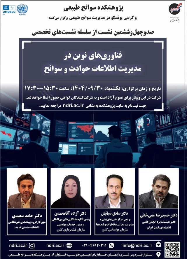 نشست فن آوری نوین در مدیریت اطلاعات حوادث وسوانح ۳۰ آذر ۱۴۰۴ | ۱۲:۰۴ کد : ۵۷۱۴۹ اطلاعیه ارسال به دیگران نام شما ایمیل شما ایمیل دریافتکننده ارسال انصراف تعداد بازدید:۲۰۹ دعوتنامه نشست فن آوری نوین در مدیریت اطلاعات حوادث وسوانح